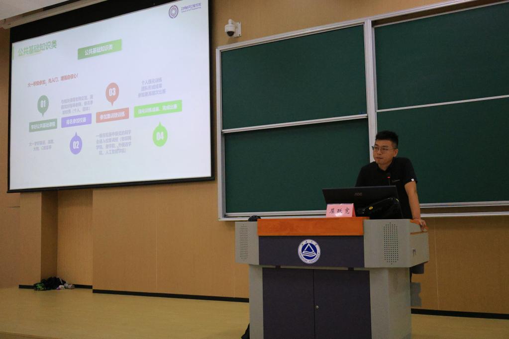 在科创竞赛启蒙板块,学院科创辅导员屈跃宽详细介绍了学院近几年在科创竞赛方面的突出成绩和资源支持。他以优秀学生的真实事例鼓励同学们要敢于创新、勇于实践,在一次次尝试中锤炼专业能力,培养科研素养。学院将为有志于参与竞赛的同学提供全方位的资源支持,构建起“教师倾囊相授、学长学姐经验分享、学院资源全面支撑”的良性培育生态。