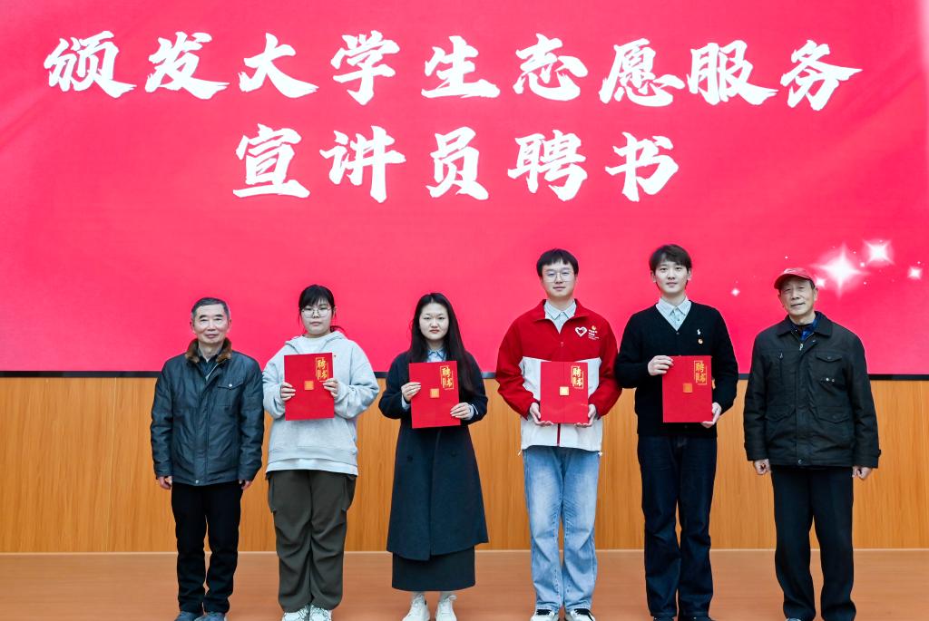 接着,吴锡生、赵曾贻共同为孟非、曲天一、刘雯丽、杜婧祎四位优秀的青春追“锋”者颁发“大学生志愿服务宣讲员”聘书,激励四位宣讲员肩负起传播志愿服务精神的重任,以自身经历激励更多同学投身志愿服务。杨艳为雷锋特称团支部赠送青春志愿读本,以书香润初心,以使命励前行。