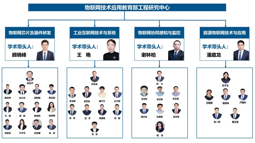 物联网技术应用教育部工程研究中心于2010年批复建设,2015年和2021年两次通过教育部验收。中心占地5000平方米,由教育部国家级重大人才工程特聘教授王艳担任主任,下设副主任2名、秘书1名。中心固定人员41人,包括国家高层次人才计划入选者3人,省部级人才入选者12人。中心立足于物联网应用技术的国际前沿,重点围绕物联网芯片及器件研发、工业互联网技术与系统、物联网协同感知与监控、能源物联网技术与应用等4个核心研究方向,深入开展应用基础、关键瓶颈技术和工程应用的创新研究。